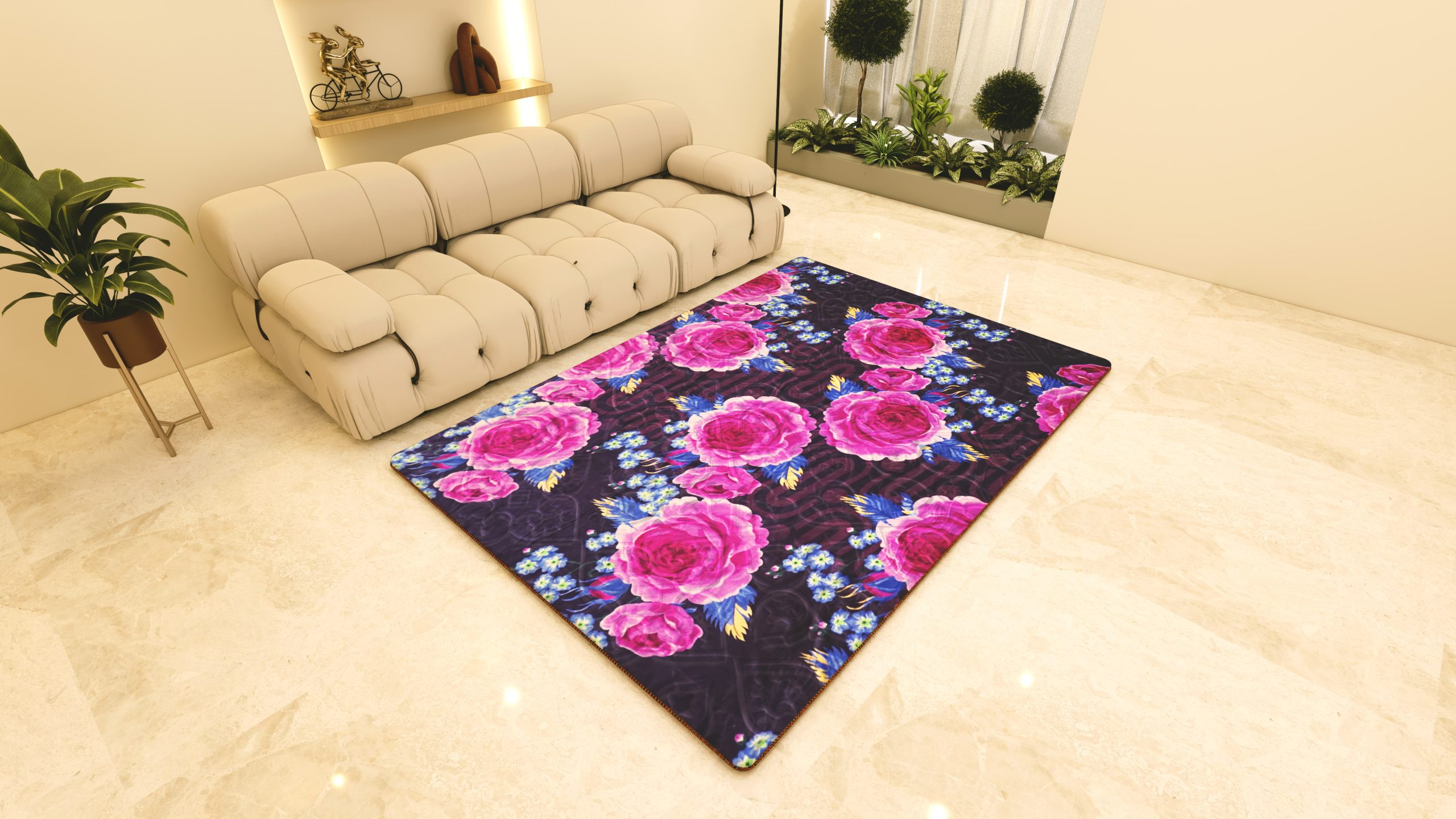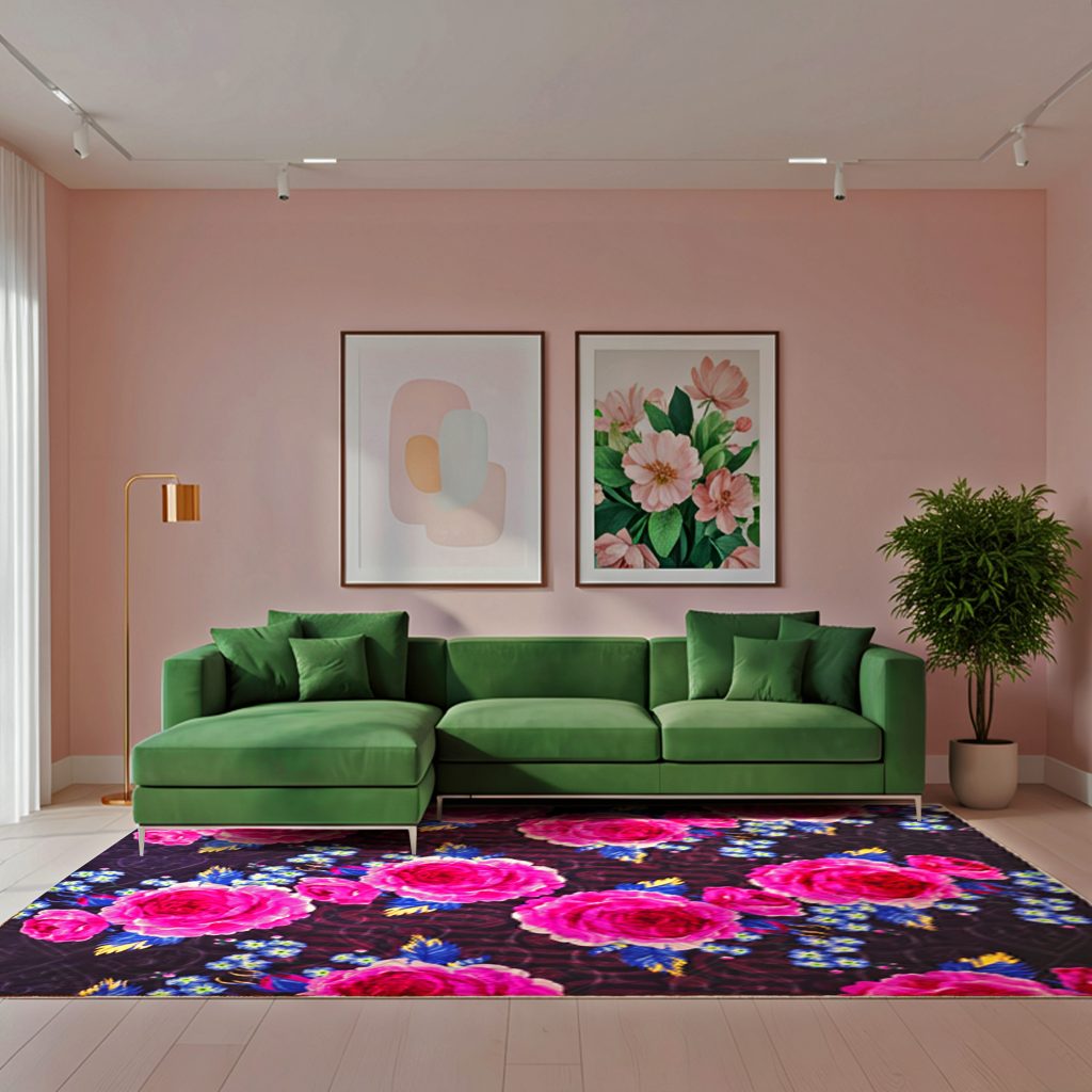 Hadirkan sentuhan romantis nan elegan ke dalam ruangan Anda dengan motif bunga mawar fuchsia yang menawan. Perpaduan harmonis antara warna ungu tua dan aksen merah muda cerah dari bunga mawar menciptakan suasana ruang tamu yang hangat dan memukau. Detail kelopak bunga mawar dan dedaunan biru keemasan yang digambarkan dengan indah memberikan kesan artistik dan menghidupkan ruangan. Karpet ini menjadi pusat perhatian di atas lantai marmer yang mewah, menambahkan sentuhan keanggunan alami dan keseimbangan visual yang sempurna.