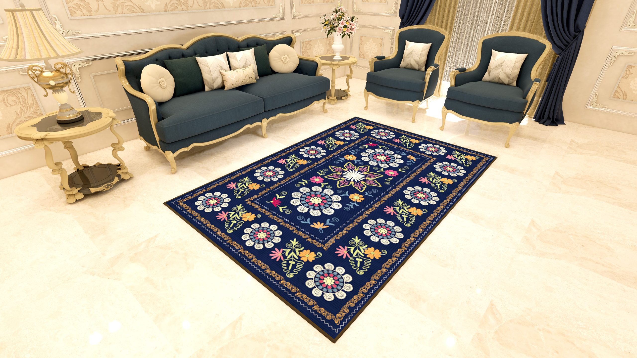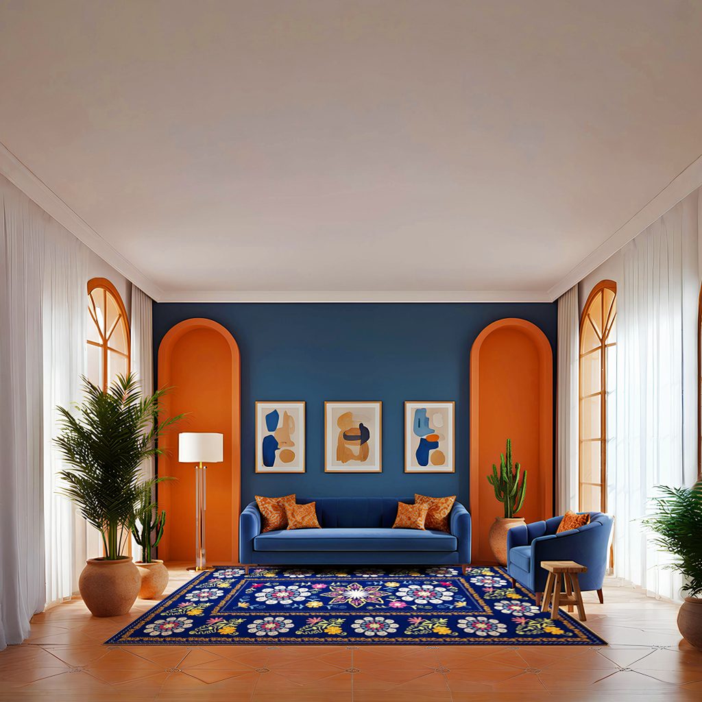 Daniel Sapphire memancarkan aura kemewahan klasik melalui warna biru safir yang mendalam dan anggun. Motif floral yang terinspirasi dari pola suzani menghadirkan komposisi pola simetris yang artistik di tengah karpet. Perpaduan warna pink cerah, kuning, dan biru muda yang mencolok menciptakan kontras visual yang menarik namun tetap elegan. Karpet ini membawa suasana ruang menjadi lebih otentik, unik, dan penuh kehangatan seni budaya tradisional.