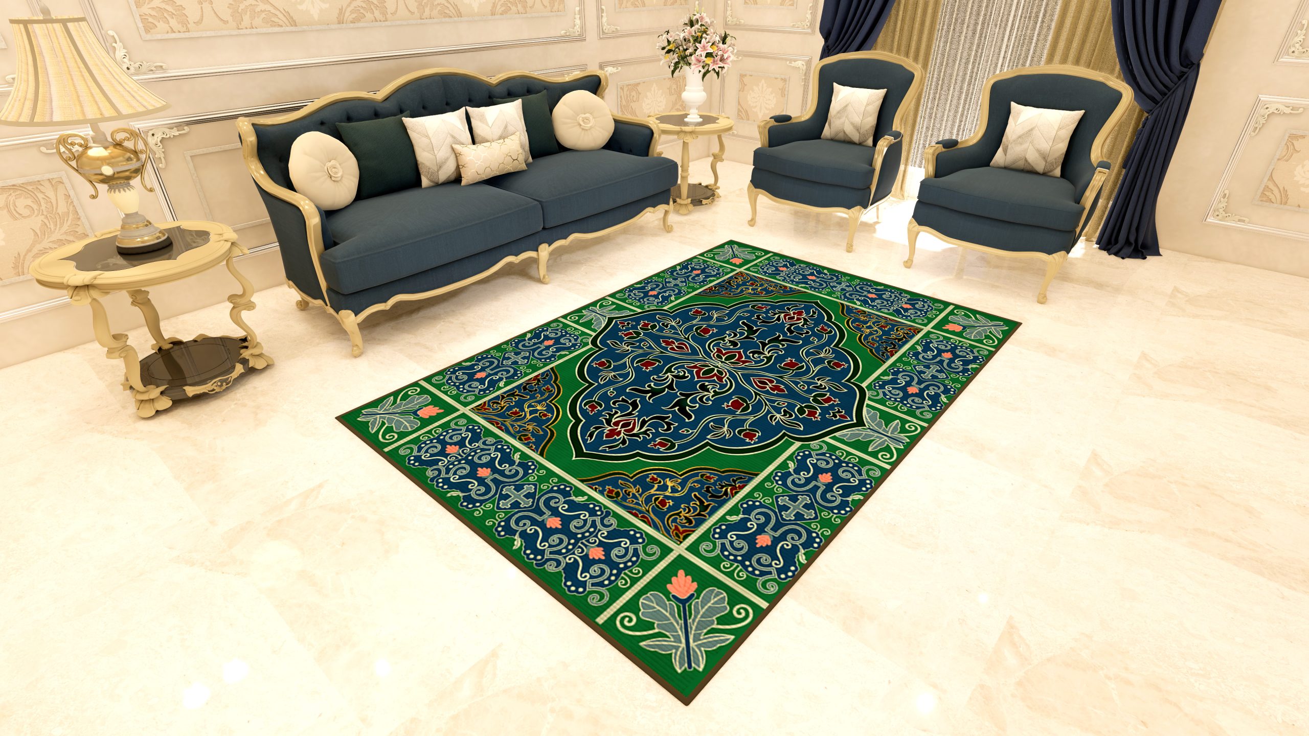 Leonard Sapphire menghadirkan pesona kemewahan biru safir yang eksklusif dan nyata ke dalam ruangan Anda. Perpaduan motif floral klasik dengan kontras warna hijau emerald menciptakan nuansa yang sangat artistik. Setiap detail ornamennya memberikan karakter mewah yang kuat, sekaligus menawarkan kelembutan material premium untuk kenyamanan maksimal di pusat hunian Anda.