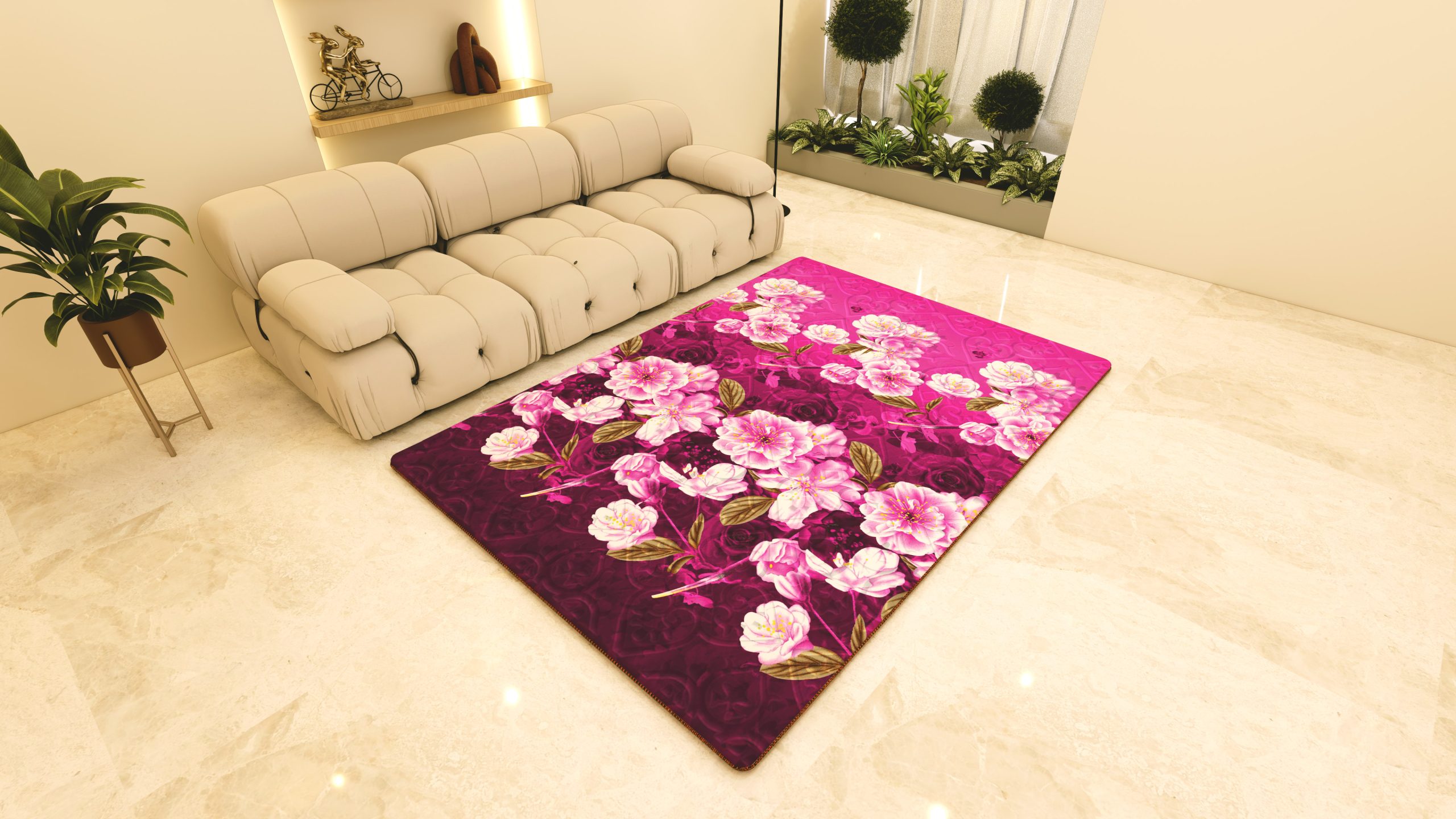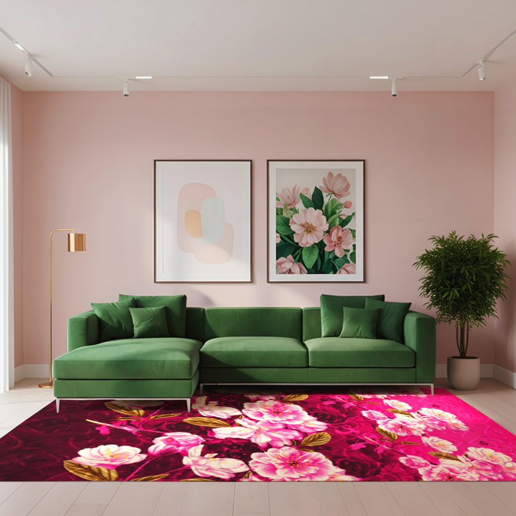 Motif bunga mekar memancarkan pesona taman musim semi melalui perpaduan warna fuchsia yang berani dan gradasi merah muda lembut. Detail mahkota bunga yang rapat dengan sentuhan putih bersih menciptakan efek dimensi yang hidup, seolah flora tersebut tumbuh nyata di permukaan lantai. Aksen daun keemasan di sela-selanya memberikan sentuhan kemewahan yang elegan, mengubah suasana ruangan menjadi lebih artistik, hangat, dan penuh karakter sebagai pusat perhatian yang memukau.