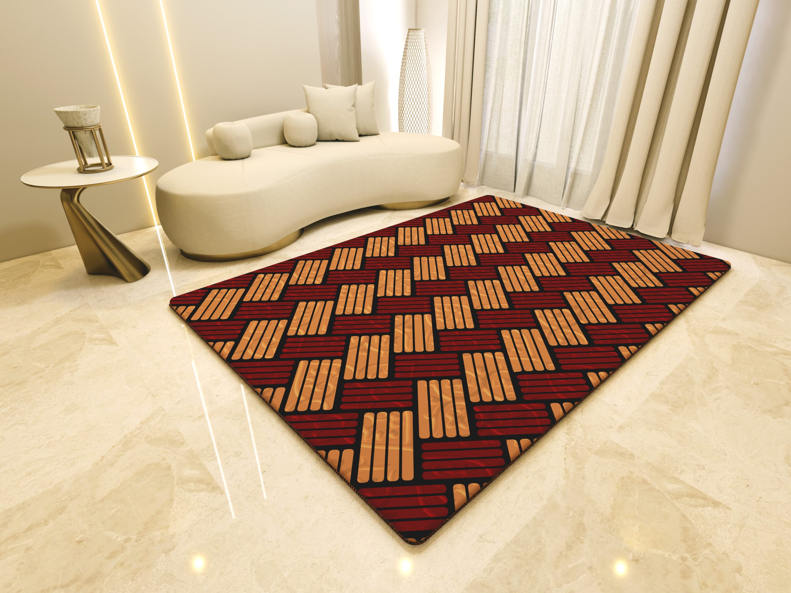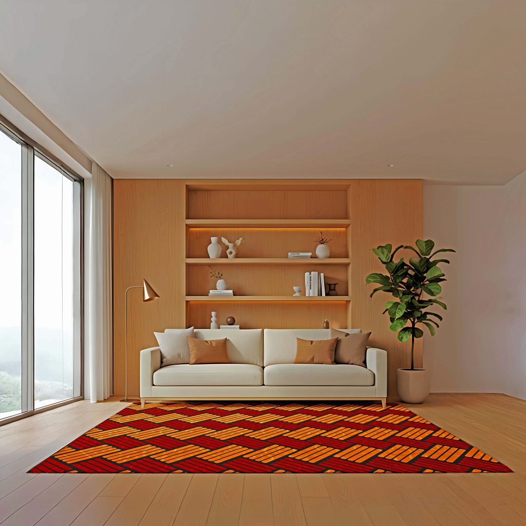 Pola lingkaran-lingkaran yang berpadu dengan garis tegas pada karpet ini melambangkan keseimbangan antara kelembutan dan ketenangan dalam sebuah hunian. Warna merah cerah yang berani di atas dasar cokelat tua menciptakan dialog visual yang hangat sekaligus penuh semangat di atas lantai marmer yang mewah. Setiap bentuk yang saling tumpang tindih ini menceritakan dinamika kehidupan modern yang terus bergerak namun tetap memiliki keteraturan yang indah. Motif ini menjadi nyawa bagi ruangan, mengubah area polos menjadi ruang yang sarat akan nilai seni dan karakter yang kuat.