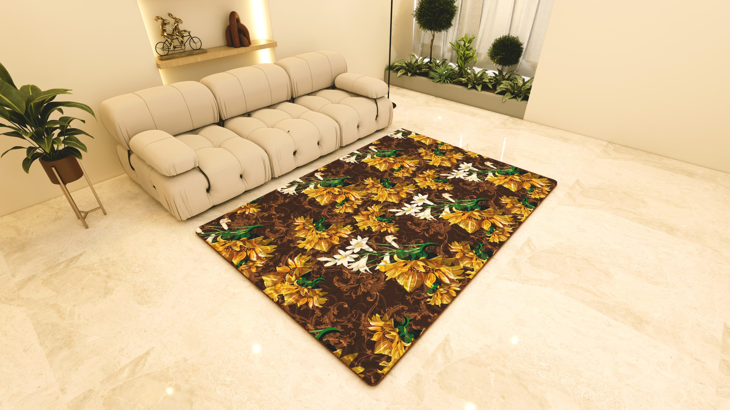 Karpet ini menampilkan desain floral yang dominan dengan motif bunga-bunga besar berwarna kuning keemasan dan putih yang tersebar merata di atas latar coklat gelap. Di antara bunga-bunga tersebut terdapat sentuhan daun dan aksen hijau yang memperkaya komposisi warna serta memberikan kesan alami dan hangat. Polanya tersusun berulang secara teratur, menciptakan tampilan yang harmonis dan elegan. Perpaduan warna hangat dan motif bunga yang cukup besar memberikan nuansa klasik, nyaman, dan cocok untuk menghadirkan suasana hangat pada ruang tamu maupun ruang keluarga.